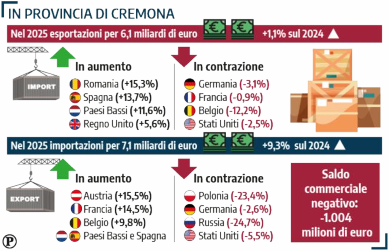 Più marcata, invece, l’accelerazione sul fronte delle importazioni, che segnano un balzo del +9,3% toccando gli oltre 7,1 miliardi di euro. Questa forbice porta il s saldo commerciale in territorio negativo, attestandosi a oltre -1.004 milioni di euro. L’analisi delle dinamiche dell’interscambio commerciale 2025 è stata curata dal Servizio Promozione e Informazione Economica della Camera di Commercio di Cremona-Mantova-Pavia.