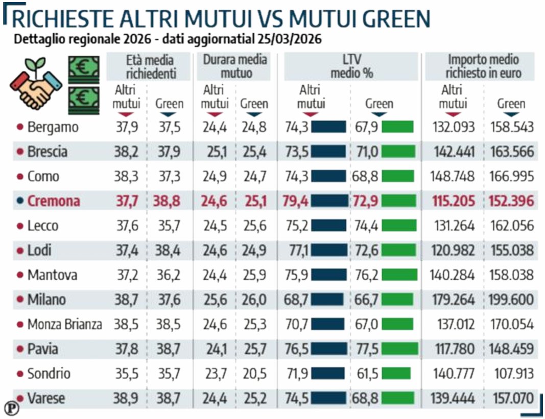 Interessanti anche altri dati frutto dell'indagine di MutuiOnline.it: nella nostra provincia l'età media dei richiedenti è 37,7 anni per i mutui generici e 38,8 per quelli green. Ed è proprio quest'ultima età a collocarci all'ultimo posto regionale, perché in Lombardia sono proprio i cremonesi quelli che sottoscrivono più tardi i mutui per immobili green. I più giovani, al contrario, sono i residenti di Lecco e Sondrio. La durata media dei mutui a Cremona è 25,1 anni per i green e 24,6 per gli altri. Il loan to value (ltv), che si calcola facendo la divisione tra la cifra del prestito erogato e il valore dell'immobile che si intende acquistare, nella nostra provincia è in media del 72,9% per i mutui green e del 79,4% per gli altri.
