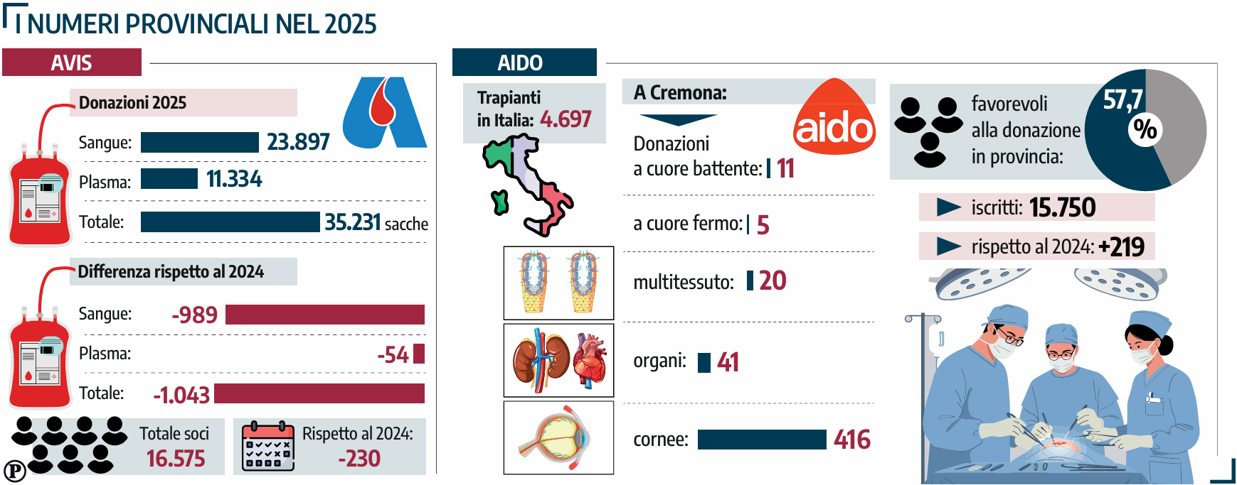 A fare il punto della situazione è stato il presidente dell’Avis cremonese, Cristiano Manfredini: dopo aver illustrato le numerose attività svolte dall’associazione nel corso del 2025 — 40 ore di comitati esecutivi, 214 ore di consiglio direttivo, 630 ore di incontri e riunioni — il presidente si è soffermato sul nodo delle donazioni, tracciando il quadro generale in provincia e nella Penisola.