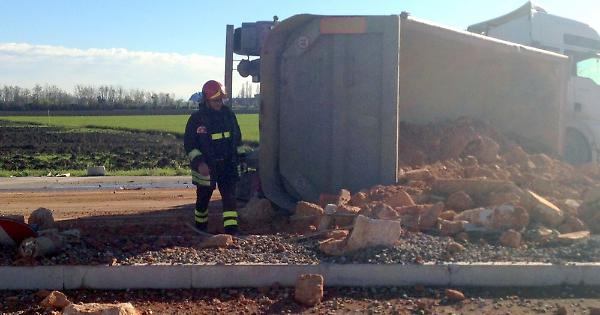 Il camion ribaltato e i mattoni sparsi sulla strada a Caorso