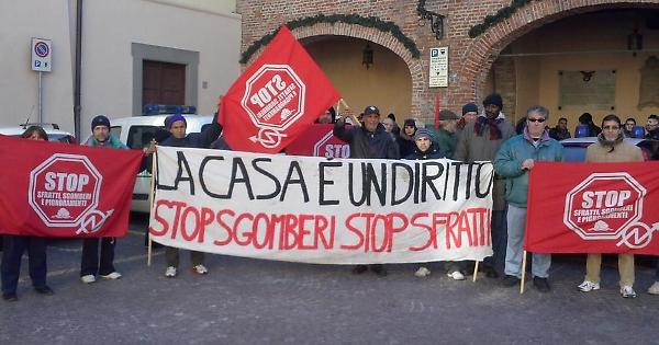 Si tratta di una nuova azione del comitato Antisfratto che sta supportando una famiglia di Soncino in lotta per la casa. L’ufficiale giudiziario, giovedì mattina, si è recato per la terza volta presso una abitazione per sfrattare una famiglia di origine marocchina (padre, madre e tre figli minorenni), ma, questa volta, si è trovato davanti il picchetto del comitato Antisfratto di Cremona e alcuni membri di quello di Brescia. Il commissario non ha potuto eseguire il proprio lavoro, rimandandolo di un paio di settimane. Il comitato, insieme al papà, ha successivamente 'preso possesso' del Comune fino all'incontro con le istituzioni.
