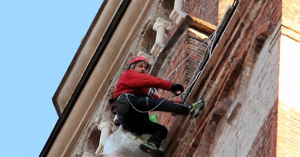 CREMONA - Un uomo in rosso arrampicato sul Torrazzo. Questa mattina in molti, col naso all'insù, hanno notato l'insolita presenza sulla facciata della torre campanaria della Cattedrale: non si tratta di un aspirante spider man né di un acrobata esibizionista, ma di un operaio specializzato, incaricato di eliminare l'erba cresciuta negli interstizi fra i mattoni. Un intervento da veri professionisti, spettacolare e non senza rischi: per affrontare una simile scalata occorre perlomeno essere avvezzi alle emozioni 'd'alta quota'. Senza contare che la rimozione delle essenze vegetali - spuntate con la fondamentale complicità della proverbiale umidità cremonese - richiede una precisione certosina. L'uomo ragno del Torrazzo merita un applauso.
