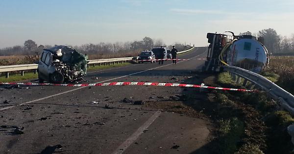 MALEO - Schianto mortale, questa mattina, sulla tangenzialina che collega Pizzighettone a Codogno, in territorio di Maleo: la vittima è Marco Uggeri, 43enne di Robecco d'Oglio, morto sul colpo nello scontro frontale con un camion per il trasporto del latte. Un urto terrificante: la Panda condotta dal cremonese ridotta ad un groviglio di lamiere, il camion ribaltato nel fosso sul lato opposto della strada. Al volante del 'menalatte' un 50enne, rimasto ferito: le sue condizioni non sono gravi.