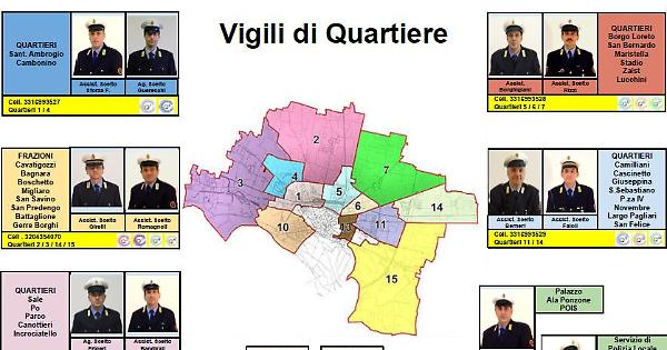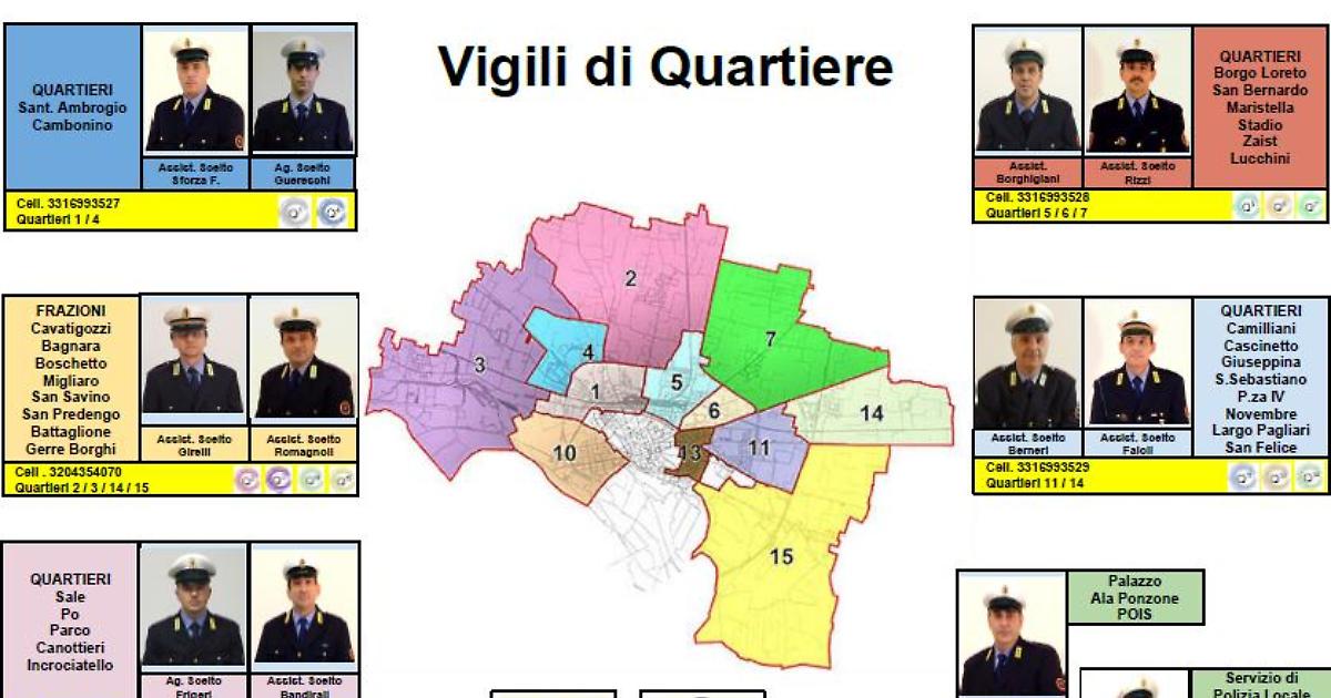Uno sforzo non indifferente, ma la sicurezza - come ha ricordato l'assessore alla partita, Francesco Bordi - è una delle priorità per l’amministrazione comunale. Per quanto riguarda la nuova organizzazione, i vigili raddoppiano nei quartieri 1 e 4; 1 e 10; 5,6 e 7; 14 e 15. Viene istituito il maxiquartiere denominato «frazioni» con due agenti, vi è poi quello in servizio al palazzo Ala Ponzone e quello intercomunale. Il responsabile dei vigili di quartiere è il vicecomandante Pierluigi Sforza, l’ufficiale di supporto operativo è il commissario Nicola Bruneri.