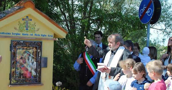 CREMONA - Don Alberto Mangili, alla presenza del sindaco di Cremona, Oreste Perri e del sindaco di Gerre de Caprioli, Silvio Guereschi, ha benedetto la nuova santella dedicata alla Beatissima Vergine Maria col Divin Figlio Gesù realizzata da Graziano Bertoldi. Hanno accompagnato la cerimonia il coro di Sant'Anna di Bosco ex Parmigiano.