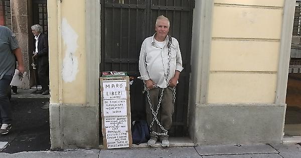 CREMONA - Nuovo atto dimostrativo di Cesare Forte, di Soncino, che nella mattinata di mercoledì 10 settembre si è incatenato davanti alla prefettura per protestare contro la detenzione dei due marò (Massimiliano Latorre e Salvatore Girone). Quella che lo stesso forte definisce "la vergogna italiana".