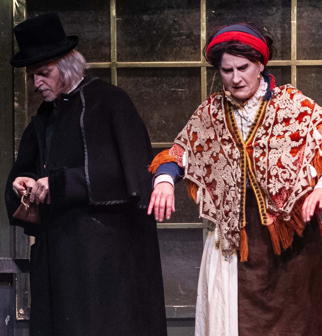 Ed è proprio questo contrasto, netto e immediato, a far entrare lo spettatore nel cuore del racconto: il Natale come coro collettivo da una parte, la solitudine e l’avarizia ostinata di un uomo dall’altra, destinata a incrinarsi passo dopo passo. Il cast regge il ritmo con energia e misura, e trova un alleato prezioso in una scenografia mobile che cambia volto con naturalezza, accompagnando la storia senza appesantirla. Ne nasce un’alternanza ben calibrata tra quadri corali, pieni di movimento e di voci, e momenti in cui tutto si restringe, si fa più intimo, quasi sospeso.