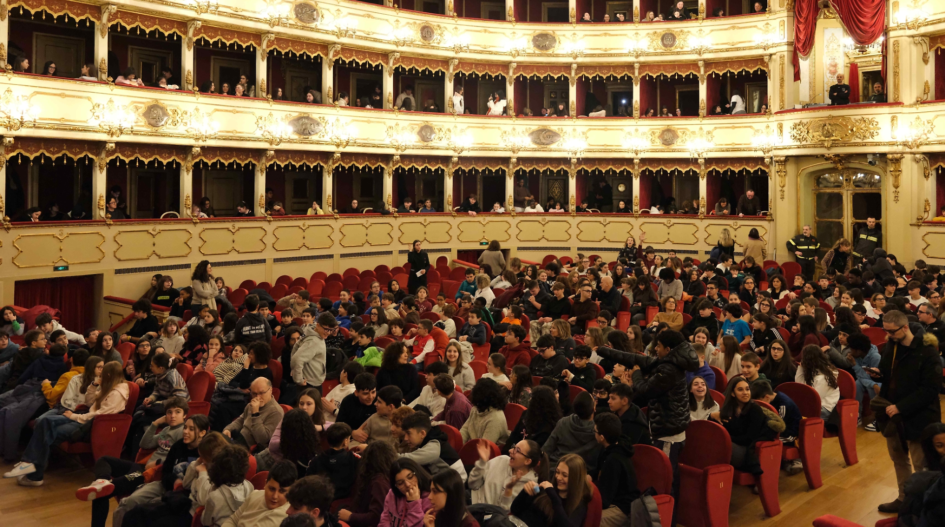 È a questi due estremi sulla funzione dell’arte che si pensa assistendo al Concerto per conchiglia e orchestra ideato e diretto da Matteo Corradini. In scena ieri mattina al Ponchielli per le scuole, il recital è stato organizzato dagli assessorati alla Cultura e all’Istruzione del Comune in occasione del Giorno della memoria. Voluto perché «un’esperienza diretta avvalora l’insegnamento» e perché «la scuola non deve solo insegnare ma anche formare», come hanno sottolineato gli assessori Rodolfo Bona e Roberta Mozzi, il reading di Corradini ha accompagnato ragazze e ragazzi a scoprire la storia dell’orchestra femminile di Auschwitz.