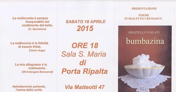 CREMA - Poesie in dialetto cremasco. Sabato 18 aprile, alle ore 18 nella sala Santa maria di Porta Ripalta in via Matteotti, verrà presentato il libro 'Bumbazina' di Graziella Vailati.