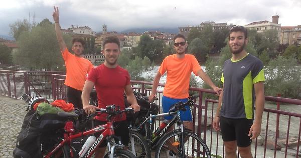 VERCELLI - Dopo essere stati svegliati dal nubifragio abbattutosi su Vercelli, decidiamo di aspettare - per iniziare la terza tappa del viaggio - che l'intensità della pioggia diminuisca. Nel frattempo, dopo una serie di esercizi di risveglio muscolare con Valerio Donnianni (tra i principali esponenti della disciplina pilates in Italia), ci dedichiamo alla manutenzione delle biciclette in attesa di condizioni meteo più favorevoli. Saliamo sulle nostre biciclette dopo aver pranzato e percorriamo l'unica strada possibile fino a Santhià, dove tagliamo il traguardo dei primi 200 km in sella. Il percorso procede intervallato da brevi soste fino al lago di Viverone; giusto il tempo di scattare qualche foto e sederci al sole, finalmente spuntato tra le nubi, e ripartiamo a ritmo sostenuto aiutati da lunghe discese e dal vento a favore. Il paesaggio rimane simile a quelli già incontrati nei primi due giorni, fino a quando intravvediamo le prime montagne e arriviamo ad Ivrea con il sole calante, dove alloggiamo all'ostello per pellegrini affacciato sul fiume Dora Baltea.