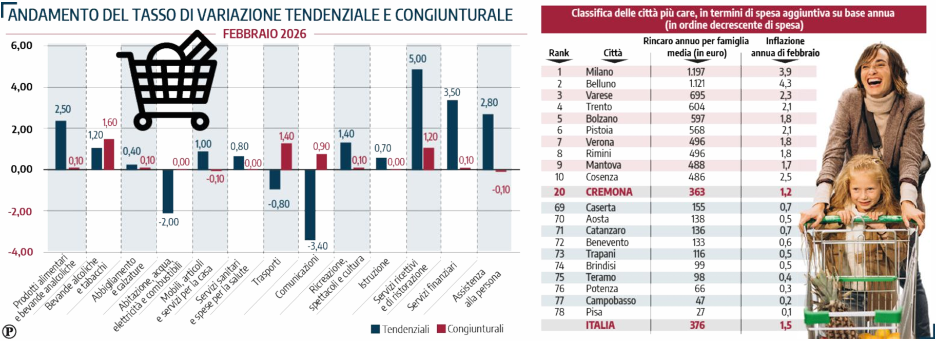 L’Unione nazionale consumatori, tramite i dati Istat, ha analizzato i prezzi in tutta Italia, decretando che è Milano (forse anche per l’effetto Olimpiadi) la provincia in cui, in febbraio, è stato registrato il rincaro spesa annuo maggiore: di 1.197 euro a famiglia, equivalente al +3,9%. Belluno in realtà svetta a livello percentuale, con un +4,3%, ma il rincaro è a quota 1.121 euro. La media italiana è invece ferma a +1,5% e dunque maggiore rispetto a quanto si registra a Cremona. Sull'altro fronte della classifica, la città più virtuosa d’Italia è Pisa, con +0,1% e un incremento spesa annuo che si ferma a 27 euro a famiglia. Al secondo posto sia per inflazione bassa che per spesa c’è Campobasso, con una variazione dei prezzi dello 0,2% e un aumento della spesa di 47 euro.