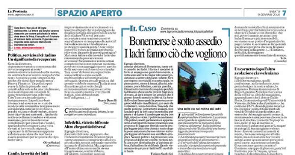 sono un abitante di Bonemerse, paese sotto assedio dei ladri. I furti e i tentativi di furto si susseguono quotidianamente, a nulla sono servite le cinque telecamere posizionate al centro del paese, infatti i furti avvengono fuori dalla via principale, in pieno giorno, niente li ferma, allarmi, telecamere, porte blindate, cani da guardia... Ormai tutto è terreno di conquista perché i ladri sanno che se anche presi in flagranza di reato, ci sarà sempre un giudice che il giorno dopo li metterà in libertà. Le forze dell’ordine fanno quel che possono con organici del tutto insufficienti, con auto da rottamare, senza benzina. Succede che molte persone, soprattutto anziani, non lasciano più la loro casa incustodita per paura o si danno il cambio per uscire con figli, nipoti o vicini. I politici cosa fanno: 256 politici, nostri parlamentari, appartenenti a tutti i partiti, hanno presentato una proposta di legge per liberalizzare le droghe leggere (ma come chimico tossicologo le posso assicurare che non esistono le droghe leggere altrimenti non sarebbero droghe). Nessun politico ha presentato una proposta di legge per colpire i predoni delle case o per depenalizzare la legittima difesa, il cittadino che si difende da solo viene messo in carcere e i ladri no! È ora di dire basta.