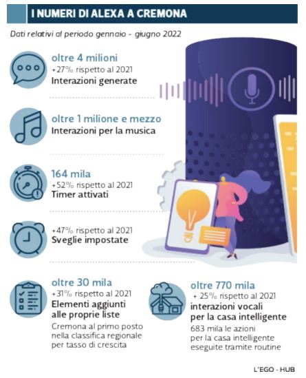 CREMONA - Alexa piace ai cremonesi. Tanto che il ricorso all’assistente vocale che «proietta» un’intelligenza artificiale basata su cloud, tramite un software che può essere integrato in speaker e altri dispositivi smart, in provincia di Cremona ha toccato negli ultimi mesi livelli da record. Nel periodo gennaio-giugno 2022, nel territorio sono state generate oltre 4 milioni di interazioni con Alexa, il 27% in più rispetto allo scorso anno, in linea con l’andamento registrato in Lombardia. Lungo il Po questa innovativa interpretazione del linguaggio naturale, che riesce ad interagire con l’uomo, ha fatto breccia. Nel semestre la Lombardia ricopre il primo posto in Italia per numero di interazioni con Alexa, con oltre 792 milioni di volte in cui i lombardi l’hanno interpellata per chiedere supporto nelle azioni di tutti i giorni: come detto, oltre un quarto in più rispetto allo stesso periodo dello scorso anno. Per tornare ai dati cremonesi, i cui utenti sono quelli, in Lombardia, che hanno sfruttato di più la funzione ‘casa intelligente’, sono oltre 164 mila i timer attivati, il 52% in più rispetto al 2021. Con Cremona che si posiziona al secondo posto nella classifica regionale (dopo Sondrio) in termini di tasso di crescita relativamente all’impostazione di timer. Anche l’impostazione di sveglie tramite Alexa è aumentata del 47%. Oltre 30 mila gli elementi che gli utenti della provincia di Cremona hanno aggiunto alle proprie liste, il 31% in più rispetto allo stesso periodo dell’anno precedente. Cremona, inoltre, risulta al primo posto nella classifica regionale per tasso di crescita relativamente all’aggiunta di elementi alle liste rispetto al 2021 (seguita da Pavia e Lodi). Un capitolo a parte merita la ‘casa intelligente’: la provincia di Cremona ha visto un aumento delle interazioni vocali per questo ambito del 25%, per un totale di oltre 770 mila interazioni vocali. Sono oltre 683 mila le azioni per la casa intelligente eseguite tramite routine. Oltre 1 milione e mezzo le interazioni con la musica.