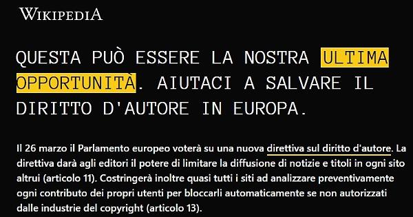 Dalle 8 e per 24 ore "le voci di Wikipedia in lingua italiana non saranno accessibili, ma rimanderanno a un banner informativo sulla riforma del diritto d'autore, in vista del voto in plenaria dal Parlamento europeo di domani". Lo fa sapere Wikimedia, l'associazione che sostiene l'enciclopedia libera. "Un'azione forte di protesta, volta a far sapere al maggior numero possibile di cittadini come la nuova direttiva potrà influire negativamente sulla libertà di espressione, sulla partecipazione e sulla creatività online".