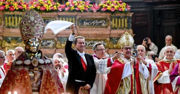 NAPOLI (19 settembre 2020) - Si è ripetuto a Napoli il prodigio del 'miracolo' di San Gennaro. L’annuncio della liquefazione del sangue è stato dato alle 10.02 in un Duomo insolitamente vuoto per la festa del santo, per le misure anti Covid-19. Ad accoglierlo l’applauso dei fedeli presenti. Il sangue era già sciolto nel momento in cui l’ampolla è stata presa dalla teca. "Con gioia e commozione - ha detto cardinale Crescenzio Sepe, arcivescovo metropolita di Napoli - il sangue del nostro santo patrono è sciolto». Il ripetersi del 'miracolo' è letto come un buon auspicio per Napoli e la Campania. Quest’ultimo avviene tre volte l’anno: a settembre, nel giorno di S.Gennaro, nel sabato che precede la prima domenica di maggio, a dicembre. (ANSA)