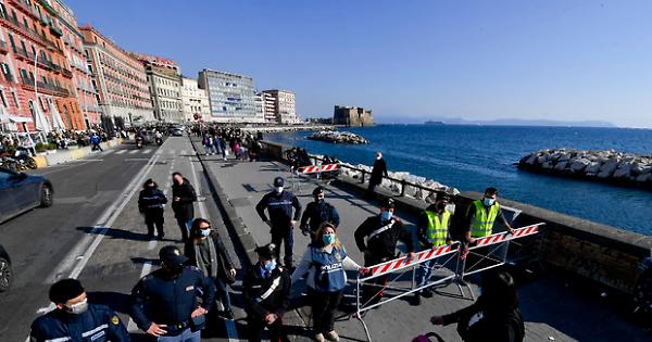 NAPOLI (20 febbraio 2021) - A causa del progressivo aumento di persone sul lungomare di Napoli è stato transennato il marciapiede che da piazza Vittoria va verso Santa Lucia. In particolare viene interdetto l'accesso consentendo solo l'uscita di chi si trova già all'interno dell'area che comprende i locali del lungomare.