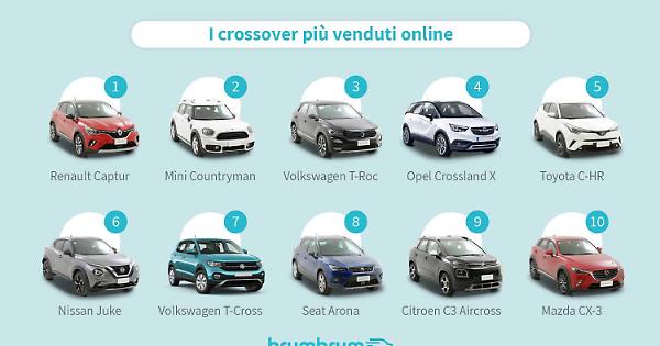 MILANO (30 marzo 2021) - Chi domina la classifica dei crossover usati più venduti online? Secondo la classifica degli ultimi 12 mesi stilata dall’Osservatorio brumbrum è Renault Captur. La vettura francese sbaraglia la concorrenza piazzandosi davanti a Mini Countryman e Volkswagen T-Roc. Appena giù dal podio Opel Crossland X, che supera due crossover giapponesi: Toyota C-HR e Nissan Juke. Settima un’altra Volkswagen, la T-Cross. Chiudono la top ten Seat Arona, Citroen C3 Aircross e Mazda CX-3.