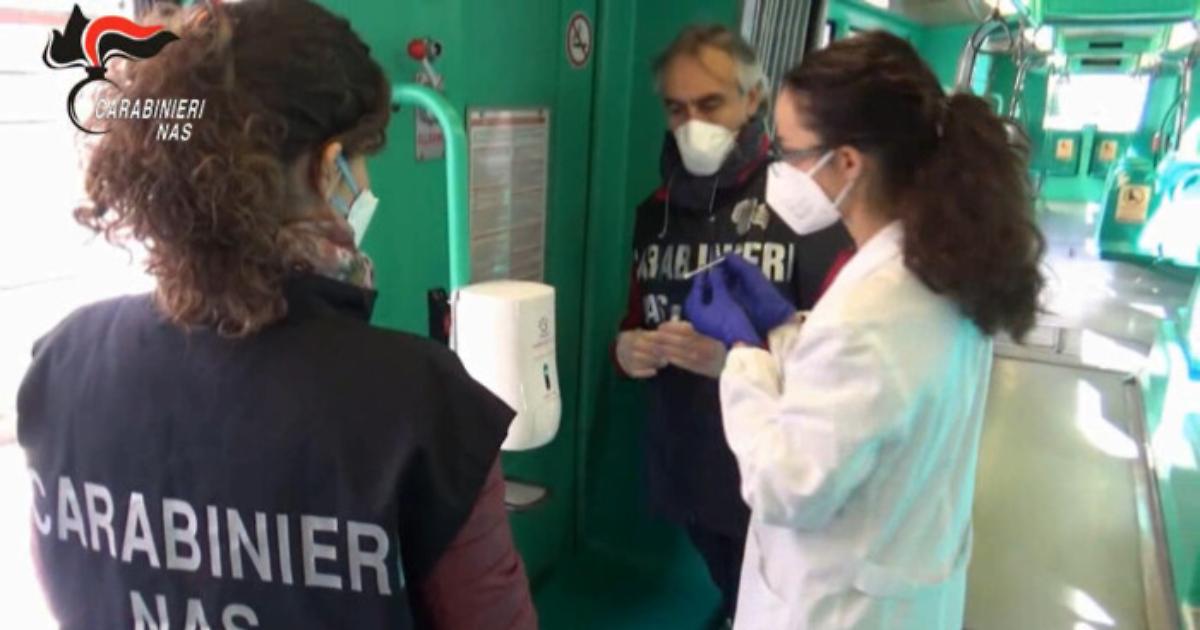 ROMA (6 aprile 2021) - Campagna di controlli anti-Covid dei Carabinieri dei Nas su 693 mezzi pubblici in tutta Italia. I militari hanno rilevato attraverso tamponi sulle superfici 32 casi di positività a Roma, Viterbo, Rieti, Latina, Frosinone, Varese e Grosseto. I tamponi hanno rivelato "la presenza di materiale genetico riconducibile al virus in autobus, vagoni metro e ferroviari". Seppure non virulento, il materiale rinvenuto dimostra "con certezza il transito e il contatto di individui infetti a bordo del mezzo" analizzato. (ANSA)