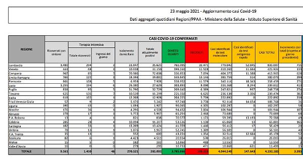 ROMA - Sono 3.992 i nuovi casi di Coronavirus in Italia (ieri 4.717) a fronte di 179.391 tamponi effettuati su un totale di 64.558.486 da inizio emergenza. È quanto si legge nel bollettino del Ministero della Salute-Istituto Superiore di Sanità del 23 maggio. Nelle ultime 24 ore sono stati 72 i decessi (ieri 125), che portano il totale di vittime da inizio pandemia a 125.255. Con quelli di oggi diventano 4.192.183 i casi totali di Covid in Italia. Attualmente i positivi sono 281.092 (-2.652), 270.521 le persone in isolamento domiciliare. I ricoverati in ospedale con sintomi sono 9.1621 di cui 1.410 in Terapia intensiva. I dimessi/guariti sono 3.785.866 con un incremento di 6.573 unità nelle ultime 24 ore. La regione con il maggior numero di nuovi casi nelle ultime 24 ore è la Lombardia (711), seguita da Campania (628), Lazio (413), Toscana (382). . spf/sat/red 23-Mag-21 17:34