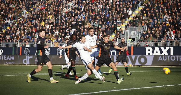 VENEZIA - Dopo la cocente delusione in SuperCoppa, l'Inter torna a correre in campionato, battendo per 1-0 il Venezia al Penzo. Il gol vittoria è stato realizzato da Darmian nel corso del primo tempo. Un successo d'oro per i campioni d'Italia, al sesto successo consecutivo fuori casa in Serie A (senza subire reti). Non è stata, però, una partita semplice per i nerazzurri contro un Venezia mai domo e "vivo" sino alla fine: i lagunari hanno colpito pure un legno con Busio. Per la trasferta contro i lagunari Inzaghi è costretto a fare i conti con le assenze illustri a centrocampo di Calhanoglu e Mkhitaryan, out al pari di Acerbi, Bisseck e Correa: trovano allora spazio dall'inizio in mediana Zielinski e Asllani. Turno di "riposo", con panchina in avvio sia per Thuram che per Dimarco. Sin dai primi minuti i nerazzurri impongono il proprio gioco, creando diverse palle gol. Da sottolineare anche l'ottima prova di Stankovic, cresciuto proprio nel vivaio interista e più volte provvidenziale nel tenere in piedi il Venezia. La rete che stappa la partita arriva al 16' e porta la firma di Darmian, autore di un facile tap-in a porta vuota (Stankovic aveva appena parato una bella conclusione di Lautaro). Terminano alte, invece, le successive conclusioni di Taremi e Carlos Augusto: poco insidiose anche le due punizioni battute da Asllani. Dall'altra parte, il Venezia compare in area avversaria solo al 28', quando Bastoni deve intervenire per murare la conclusione di Pohjanpalo. In apertura di ripresa, però, l'Inter rischia subito la beffa e, al 50', Sommer deve compiere un intervento miracoloso sul colpo di testa di Doumbia. Il Venezia tiene bene il campo, mentre la formazione ospite fallisce a più riprese il colpo del ko. Al 67' il neoentrato Frattesi viene servito in profondità da Lautaro con un assist illuminante: l'italiano (al centro di diverse voci di mercato) si fa ipnotizzare da Stankovic. Lo scarso cinismo dei nerazzurri non viene punito nemmeno al 73', quando Busio colpisce il palo a Sommer battuto. Il Venezia prende allora fiducia, mentre l'Inter soffre nel finale. L'ultimo brivido della partita è il tiro centrale di Pohjanpalo in pieno recupero, bloccato da Sommer per aprire la festa nerazzurra. - foto Ipa Agency - . xl9/pdm/red 12-Gen-25 17:11