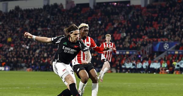 EINDHOVEN (OLANDA) - L'Arsenal travolge il PSV vincendo la gara d'andata degli ottavi di Champions per 7-1. Match praticamente a senso unico, decisive le reti di Odegaard (doppietta), Timber, Nwaneri, Merino, Trossard e Calafiori. Sconfitta pesantissima per gli olandesi che ai playoff avevano superato la Juventus, la qualificazione ora è una missione praticamente impossibile. Nonostante le tante assenze (Saka e Martinelli non saranno a disposizione per circa un mese) e senza centravanti, i londinesi hanno iniziato col piede giusto una partita che si è messa subito in discesa: l'unico brivido è arrivato con la traversa colpita da Salibari, una ghiotta occasione non sfruttata dai padroni di casa e che ha svegliato l'Arsenal. Nel giro di tredici minuti sono arrivate tre reti: al 18' però Timber - dopo un'azione manovrata - ha ribadito in rete il cross di Rice. Tre minuti più tardi, al 21', Merino - adattato da Arteta nel ruolo di centravanti - è riuscito a confezionare la sponda per il 2-0 firmato da Nwaneri. Al 31' un pasticcio difensivo del PSV, culminato con l'errore di Flamingo, ha permesso allo stesso Merino di firmare il terzo gol della serata. Soltanto il rigore realizzato da Lang, assegnato per una sbracciata di Partey su De Jong, ha permesso alla squadra di Bosz di tenere momentaneamente aperto il discorso qualificazione. Diverse le proteste da parte dei padroni di casa poco prima della terza rete incassata, Gil Manzano ha graziato Lewis-Skelly (già ammonito) dopo un fallo. L'effetto del penalty si è esaurito dopo appena due minuti quando Odegaard, dopo una respinta sbagliata di Benitez, ha ribadito in porta la quarta rete. Dopo appena un minuto Calafiori e Trossard hanno costruito il gol della manita, il belga con un tocco sotto ha scavalcato il portiere avversario dopo l'ottimo filtrante del difensore azzurro. Ancora Odegaard, al 28', ha segnato il 6-1 con un tiro dalla distanza, Calafiori ha poi messo la ciliegina sulla torta con il diagonale che ha chiuso il match sul 7-1. - foto Ipa Agency - . pia/gm/red 04-Mar-25 23:11
