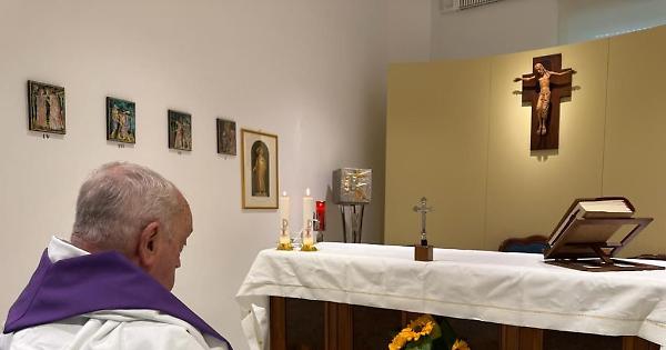 ROMA - Sono stabili le condizioni di Papa Francesco, ricoverato al Gemelli dallo scorso 14 febbraio. E dopo 31 giorni il Vaticano ha diffuso la prima foto del Pontefice: nell'immagine si vede il Papa, sulla sedia a rotelle e ripreso di lato, che concelebra la Messa nella cappellina dell'ospedale. - Copyright foto: Sala Stampa della Santa Sede - . fsc/com 16-Mar-25 19:29