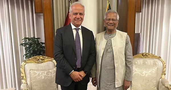 DACCA (BANGLADESH) - Il ministro dell'Interno Matteo Piantedosi in visita ufficiale a Dacca, dopo un incontro con il suo omologo ministro dell'Interno Jahangir Alam Chowdhury, è stato ricevuto dal Capo del Governo Muhammad Yunus, Premio Nobel per la Pace nel 2006. "Piena convergenza sui temi migratori - ha dichiarato Piantedosi - in particolare sull'importanza di contrastare le reti criminali transnazionali che incentivano ed organizzano il traffico di esseri umani e, al contempo, sulla promozione di percorsi di formazione-lavoro per i cittadini bangladesi con apposite quote di ingresso regolare per lavorare in Italia. Abbiamo convenuto sull'importanza, per entrambi i nostri paesi, di quote di ingresso regolari e, al contempo, di una cooperazione rafforzata per contrastare le partenze illegali ed il traffico di esseri umani. Domani tutto questo verrà formalizzato con la sottoscrizione di un apposito accordo". - Foto ufficio stampa ministero dell'Interno - . sat/com 05-Mag-25 20:28