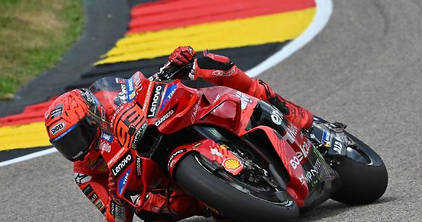 BRNO (REPUBBLICA CECA) - Marc Marquez e la sua Ducati al comando della sessione di Practice del Gran Premio della Repubblica Ceca, sul circuito di Brno, dodicesimo appuntamento del Mondiale di MotoGP. Sessione quasi interamente condizionata dalla pioggia, che non ha permesso ai piloti di provare il nuovo asfalto asciutto calcato in mattinata. È di 2'03"935 il tempo del leader del Mondiale, che precede i francesi Johann Zarco (Honda LCR) e Fabio Quartararo (Yamaha) rispettivamente di 0"469 e 0"530. Bene Jorge Martin, che al ritorno in pista in Aprilia si piazza quinto dietro il compagno Marco Bezzecchi. In Q2 anche Enea Bastianini (Ktm Tech3) con l'ottavo crono davanti ad Alex Marquez (Ducati Gresini). Dovrà passare dal Q1 Francesco Bagnaia (Ducati), oggi 13°; indietro anche Fabio Di Giannantonio (Ducati VR46), 16°. - foto Ipa Agency - . xn9/glb/red 18-Lug-25 16:33