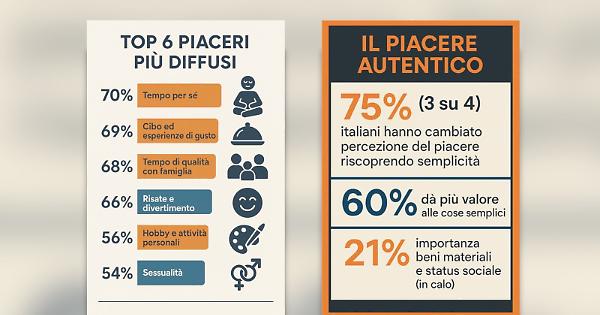 MILANO - Gli italiani riconoscono il piacere autentico nelle piccole cose, semplici e accessibili, e non ad esempio nel lusso o nella popolarità tra amici e social media: è quanto emerge dalla ricerca condotta da AstraRicerche per Imperial Brands, azienda globale di beni di consumo, in occasione del lancio del nuovo prodotto PULZE 3.0, il nuovo dispositivo a tabacco riscaldato. Dalla ricerca emerge come la percezione del piacere cambi nel tempo: quasi 3 italiani su 4 dichiarano di aver modificato nel corso della vita la propria percezione di "piacere autentico". A guidare questo cambiamento è soprattutto una riscoperta della semplicità: il 60% degli intervistati afferma di aver imparato a dare più valore alle cose semplici, una tendenza che cresce con l'età. Parallelamente, si riduce l'importanza attribuita ai beni materiali o allo status sociale (21%). Un'evoluzione che sembra riflettere un percorso di maturazione personale, spesso anche innescato da esperienze di vita significative (36%) - in particolare tra le donne della Generazione X e dei Baby Boomers - e da una maggiore consapevolezza di sé e dei propri bisogni reali (35%). Le influenze esterne, come quelle provenienti da amici, familiari (13%) o dalla società (7%), giocano un ruolo più marginale, anche se risultano più incisive nella Gen Z. Si evidenzia una netta differenza tra donne e uomini nel modo in cui vivono il piacere. Le donne si dimostrano più orientate verso una dimensione relazionale ed emotiva: per loro il piacere autentico si manifesta soprattutto nei momenti di qualità con le persone care (68%) e nella cura di sé e del proprio benessere emotivo (70%). Sono anche più propense a considerare il piacere come uno strumento di benessere mentale: il 90% delle donne lo ritiene utile per ridurre lo stress e l'89% lo associa a un modo per essere più autenticamente sé stesse. Gli uomini, invece, mostrano una maggiore attenzione alla realizzazione personale e professionale: la gratificazione derivante dal successo lavorativo è più diffusa tra loro (36%), così come la ricerca di piaceri più individuali e legati allo status. Su un campione di 1.025 individui, rappresentativi della popolazione generale italiana tra 18 e 70 anni in termini di sesso, età e area geografica, tra le attività più piacevoli il 70% degli intervistati segnala il tempo per sé (ad esempio lettura, musica, leggera attività fisica) e il relax e l'attività all'aria aperta. Seguono a ruota con variazioni minime il cibo e le esperienze di gusto (69%); il tempo di qualità passato con famiglia o persone care (68%); le risate e il divertimento (66%); la pratica di un hobby o di un'attività personale (56%); la sessualità (54%). Ma se i piaceri legati alle emozioni, al benessere emotivo e alle relazioni coinvolgono la maggioranza della popolazione, i piaceri basati su status, consumo o popolarità interessano solo una minoranza, segno che per molti, la felicità non si trova nel prestigio o nell'apparenza, ma nell'autenticità. Notevole, infatti, lo scarto con i piaceri più "superficiali", che si posizionano in fondo alla classifica: la realizzazione professionale e ricoprire posizioni di prestigio (36%), viaggi ed esperienze costose (32%), l'acquisto di beni cari o di lusso (22%), la popolarità tra amici (21%) e sui social media (10%). È evidente una svolta valoriale: per la maggior parte degli italiani, il piacere autentico non è un'esibizione, ma un'esperienza legata alle emozioni, alla connessione umana e alla semplicità. A guidare questa "cura del piacere" è innanzitutto il contatto con la natura: oltre la metà degli intervistati (56%) dichiara di dedicare regolarmente tempo all'aria aperta, considerandola una fonte primaria di benessere emotivo. Seguono la vicinanza alle persone care (48%) e la scelta di circondarsi di chi fa stare bene. Molti italiani (46%) dichiarano anche di organizzare attivamente momenti piacevoli, che siano legati a hobby, relax o attività da vivere da soli (39%) o con la famiglia (36%). Importante anche il bisogno di rallentare: il 39% cerca di fare pause e ridurre i ritmi, mentre un italiano su tre coltiva la gratitudine per le piccole cose. Altri scelgono di disconnettersi dalla tecnologia (23%) per ritrovare presenza e consapevolezza. In fondo alla lista, ancora una volta, si trovano le strategie centrate sul possesso: appena il 15% cerca il piacere tramite lo shopping. - foto ufficio stampa Noesis - . fsc/sat/com 17-Set-25 12:05