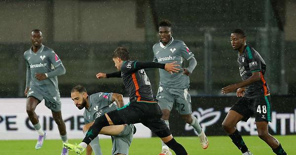 VERONA - Il Venezia batte il Verona ai calci di rigore (4-5) e accede agli ottavi di finale di Coppa Italia, dove sfiderà l'Inter. Dopo lo 0-0 dei tempi regolamentari, è il penalty decisivo di Lella, dopo l'errore di Ebosse, a regalare agli uomini di Stroppa il successo nel derby veneto allo stadio Bentegodi, certificando la crisi dei ragazzi di Paolo Zanetti, ancora a secco di successi in stagione nei novanta minuti. Poche le emozioni corso della gara. Le due squadre lasciano il campo al duplice fischio con un tiro nello specchio a testa e una percentuale di possesso palla (63%) che sorride al Venezia. La migliore occasione dei primi quarantacinque minuti è proprio dei lagunari. Al 31' Compagnon sfonda sulla destra, entra in area e lascia partire un tiro indirizzato all'angolino basso, ma Perilli in tuffo devia la conclusione in calcio d'angolo. La gara non si accende e nel secondo tempo, dopo due minuti, è un acquazzone (con tanto di grandine) a spingere l'arbitro Calvazara a interrompere la gara. Dopo diciassette minuti di stop, è il Venezia ancora una volta a sfiorare il gol dell'1-0: il neo entrato Sagrado riceve palla nella zona sinistra dell'area, calcia col destro a giro e colpisce il palo a Perilli battuto. È un episodio isolato in una partita che continua a viaggiare su ritmi bassi, confermando le difficoltà dell'Hellas nella produzione offensiva come testimoniano i due soli gol fatti in quattro partite in questo avvio di campionato. Si va quindi ai calci di rigore. Plizzari ipnotizza Ebosse dagli undici metri, mentre il Venezia è infallibile. L'ultimo rigore porta la firma di Lella, che vale una trasferta a San Siro. - Foto Ipa Agency - . spf/mc/red 24-Set-25 21:09
