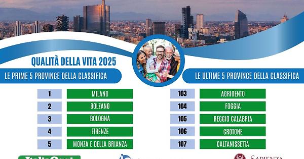 MILANO - Milano conquista nuovamente il primo posto, con ottimi risultati nella dotazione di servizi, reddito, gestione delle infrastrutture, vitalità del tessuto produttivo, seguita da Bolzano e Bologna, nell'Indagine annuale sulla qualità della vita 2025 nelle province italiane, realizzata da ItaliaOggi e Ital Communications, in collaborazione con l'Università Sapienza di Roma, giunta alla 27^ edizione. Rispetto alla classifica dello scorso anno, per Milano e Bolzano si tratta di una conferma, mentre migliora Bologna che sale di una posizione. Due passi indietro, invece, per Monza e della Brianza, mentre si segnala un significativo avanzamento in graduatoria di Rimini e Ascoli Piceno, rispettivamente al 12° e 15° posto, con oltre venti posizioni guadagnate rispetto al 2024. Ancora in fondo alla classifica Caltanissetta (107ª), preceduta da Crotone (106^), che scende di cinque posizioni in un anno e Reggio Calabria (105^), che invece conquista un posto. Da rilevare, in negativo, Foggia, che passa dalla 93^ alla 104^ postazione in classifica, Pordenone dalla 9^ alla 23^ e Gorizia dalla 26^ alla 52^. Lo studio si articola in nove dimensioni d'analisi: affari e lavoro, ambiente, istruzione e formazione, popolazione, reati e sicurezza, reddito e ricchezza, sicurezza sociale, sistema salute, turismo intrattenimento e cultura, che hanno permesso di indagare in maniera approfondita i molteplici aspetti relativi alla qualità della vita a livello locale. Le 107 province italiane sono state classificate in 5 cluster (Mediterraneo, Francigena, Adriatico, Padania, Metropoli), ottenendo così una fotografia più dettagliata delle specificità territoriali. La qualità della vita nel 2025 è risultata buona o accettabile in 60 province su 107. Si tratta di un valore inferiore a quello registrato negli ultimi anni e quindi indicativo di un peggioramento. L'indagine conferma anche per il 2025 la frattura esistente tra il Centro-Nord e l'Italia meridionale e insulare. Nelle regioni del Mezzogiorno, inoltre, restano significative aree di disagio sociale e personale. La qualità della vita nelle province del Nord-Ovest risulta in leggero arretramento (19 province su 25 sono nei due gruppi di testa - qualità buona e accettabile - 2 in meno rispetto alla passata edizione). Una situazione opposta caratterizza il Nord-Est, mentre nell'Italia centrale si registra un lieve miglioramento. Per le province dell'Italia meridionale e insulare, soltanto L'Aquila si classifica nel gruppo 2 (qualità della vita accettabile), contro le due (Pescara e Teramo) censite lo scorso anno. Gli indicatori della dimensione "Affari e lavoro" riportano informazioni sul mercato occupazionale, sulle imprese, sull'importo dei protesti per abitante e sulla incidenza di startup e Pmi innovative. Bolzano si classifica al primo posto come nelle tre passate edizioni, seguita da Firenze (che si trova al quarto posto) e che scala ben 16 posizioni rispetto allo scorso anno. A seguire Prato, Padova e Trento. In coda alla classifica troviamo esclusivamente province dell'Italia meridionale e insulare: Agrigento, Siracusa e Napoli. La dimensione dell'ambiente è articolata in due sottodimensioni: quella negativamente associata alla qualità della vita comprende indicatori di impatto ambientale, mentre nella sottodimensione positiva figurano anche variabili il cui andamento può essere messo in relazione con le azioni degli amministratori locali. È ancora Bolzano in vetta: apre la classifica della qualità ambientale, seguita da Bologna, Bergamo e Reggio Emilia. Nelle 19 posizioni di testa figurano 6 province del Nord-Ovest; 12 province del Nord-Est e Macerata in rappresentanza dell'Italia centrale. In coda si confermano anche per il 2025 Palermo e Catania. Ascoli Piceno apre la classifica della dimensione relativa a reati e sicurezza, scalando dieci posizioni rispetto allo scorso anno. Seguono nell'ordine Oristano, Potenza, Matera e Treviso. L'analisi dei risultati rilevati in questa e nelle passate edizioni denota una sostanziale stabilità del quadro relativo alla sicurezza. Infatti, anche quest'anno le province in cui la sicurezza è risultata buona o accettabile ammontano a 65, dato in linea con quello delle ultime sette edizioni dell'indagine, un risultato quindi stabile nel tempo e molto positivo. In coda troviamo Roma, Trieste, Firenze e, ultima, Milano. Per il 2025, nella dimensione della sicurezza sociale sono stati sostituiti 5 dei 12 indicatori in cui si articola. È subentrato il dato relativo ai NEET (percentuale di giovani tra i 15 e i 29 anni che non sono impegnati né in percorsi di istruzione o formazione, né nel mondo del lavoro). Al posto dei 4 indicatori rimossi troviamo: omicidi stradali ogni 100 incidenti stradali, dai morti per abuso di alcol per 100 mila abitanti, dai morti per abuso di sostanze stupefacenti per 100 mila abitanti e, infine, dall'indice di affollamento carcerario. La provincia che quest'anno apre la classifica è Ascoli Piceno, seguita da Lodi, Prato, Siena e Ragusa, mentre chiude quella del Sud Sardegna. Sono 6 gli indicatori della dimensione Istruzione e formazione: tasso di partecipazione alla scuola dell'infanzia, percentuale di persone di età compresa tra 25 e 64 anni in possesso di un diploma di istruzione secondaria superiore, percentuale di persone di età compresa tra 25 e 39 anni con laurea o altri titoli, percentuale di persone di età compresa tra 25 e 64 anni coinvolte in attività di formazione permanente e la percentuale di studenti in possesso di adeguate competenze numeriche e alfabetiche. Apre la classifica Bologna, confermando il piazzamento delle passate due edizioni dell'indagine. A seguire Milano, due province del Nord-Est, Udine e Trieste, e Ascoli Piceno in rappresentanza dell'Italia centrale. Chiudono Caltanissetta e, ultima, ancora una volta, Crotone. La struttura di questa dimensione di analisi è stata profondamente modificata nel 2022, con l'eliminazione della densit