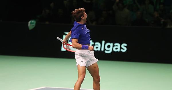 BOLOGNA - L'Italia vince la quarta Coppa Davis della sua storia, la terza consecutiva. Sul cemento indoor di Bologna è Flavio Cobolli a regalare la prima Insalatiera in casa agli azzurri, che si impongono in finale sulla Spagna col punteggio di 2-0. Dopo il successo di Matteo Berrettini per 6-3 6-4 su Pablo Carreno-Busta nel primo singolare, Cobolli chiude la contesa battendo Jaume Munar per 1-6 7-6(5) 7-5. L'Italia diventa così la prima nazione a trionfare per tre anni di fila dal 1971, dopo l'eliminazione del Challenge Round, ovvero la regola per cui i campioni in carica giocavano solo la finale l'anno successivo. "Questo era il mio sogno, siamo una squadra molto unita. Sono fiero di tutti noi e di questa squadra fa parte anche questo pubblico fantastico. Si ripete da tre giorni il giorno più bello della mia vita" le parole di Cobolli dopo la vittoria contro Munar che ha regalato la Coppa Davis all'Italia. - foto Ipa Agency - . gm/red 23-Nov-25 20:14