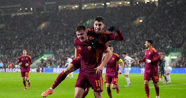 GLASGOW (SCOZIA) - È una Roma brillante e convincente quella che domina in casa del Celtic e trova la terza vittoria consecutiva in Europa League: 0-3 il risultato a favore degli uomini di Gian Piero Gasperini, che si mettono alle spalle le due sconfitte di fila in campionato, salgono a 12 punti e provano a blindare i playoff, mantenendo viva la possibilità di chiudere tra le prime otto. Tanti i cambi di Gasperini rispetto alla sconfitta di Cagliari: Dybala parte dalla panchina, alle spalle di Ferguson ci sono Soulè, unica conferma là davanti, e la novità El Shaarawy, alla prima stagionale da titolare nella competizione. A centrocampo, poi, spazio a Pisilli e El Aynaoui in mezzo, con Cristante e Koné in panchina, mentre sulla fascia sinistra c'è Rensch. I giallorossi mettono da subito in campo tanta aggressività e una pressione molto alta, da dove scaturisce il primo angolo della partita. Batte Soulè e Scales, nel tentativo di anticipare Mancini, la insacca all'incrocio alle spalle di Schmeichel: è 0-1 al 6'. Al Celtic Park è monologo giallorosso, con le fasce che lavorano molto bene e El Shaarawy che si procura qualche occasione. Si vede anche Ferguson, che colpisce un palo al 27'. Il centravanti irlandese chiude i conti nel finale di primo tempo con una doppietta, al 36' finalizzando da pochi metri l'azione tra Soulè e Celik e al 46' con il diagonale vincente dopo un ottimo stop. Prima di rientrare negli spogliatoi c'è ancora tempo per un calcio di rigore a favore del Celtic, assegnato in maniera a dir poco generosa dal croato Kovacs per un contatto tra Hermoso e Engels. Quest'ultimo si presenta dal dischetto ma colpisce il palo. Nel secondo tempo, l'ingresso di Iheanacho dà nuova linfa alla squadra di casa: l'attaccante manca una grande occasione al 53' e poi trova la rete al 64', ma il gol viene annullato per la sua posizione di fuorigioco al momento del cross di Engels. Dieci minuti più tardi viene annullato un gran gol anche a Bailey, partito in fuorigioco a inizio azione. La Roma abbassa il ritmo ma va di nuovo vicina al gol con Schmeichel che para bene con i piedi su Bailey, innescato da Dybala, che poi tenta il tap-in ma viene chiuso da Scales. L'ultimo pericolo per la Roma arriva al 92' con Svilar che blocca a terra il tentativo di Balikwisha, ma il risultato non cambia più: i giallorossi tornano da Glasgow, dove avevano già vinto un mese fa contro i Rangers, con una grande iniezione di fiducia in vista dei prossimi impegni. - Foto Ipa Agency - . mec/ari/red 11-Dic-25 23:03