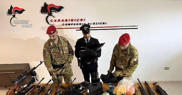 SASSARI - Blitz nelle campagne di Oschiri, in località Sos Ozzastros, dove i militari dell'Arma dei Carabinieri della Compagnia di Ozieri, con lo Squadrone Eliportato "Cacciatori Sardegna" e gli Artificieri del Comando provinciale di Sassari, hanno arrestato in flagranza un uomo per detenzione illegale di armi da guerra e comuni, fabbricazione e possesso di esplosivi, ricettazione e detenzione di droga ai fini di spaccio. Nel corso della perquisizione in un'abitazione rurale, i militari hanno sequestrato un vero e proprio arsenale: fucili, pistole - alcune con matricola abrasa - silenziatori, ottiche di precisione, un giubbotto antiproiettile artigianale, centinaia di munizioni e una pressa per la ricarica. Rinvenuti anche 27 grammi di cocaina, 9.700 euro in contanti e numerosi ordigni esplosivi artigianali con detonatori, micce e sostanze chimiche. Considerato l'alto potenziale deflagrante, il materiale esplosivo è stato distrutto sul posto dagli artificieri. L'uomo, su disposizione della Procura di Sassari, è stato trasferito nella casa circondariale di Sassari Bancali in attesa dell'udienza di convalida. foto: ufficio stampa Carabinieri . tvi/com 14-Feb-26 09:43