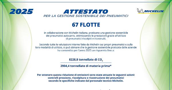 MILANO - Un pneumatico può avere fino a sei vite. È il messaggio al centro della conferenza stampa con cui Michelin Italiana ha presentato a Milano la quinta edizione dell'Attestato per la Gestione Sostenibile dei Pneumatici, iniziativa che premia le aziende di trasporto impegnate in un modello di utilizzo "multi vita" degli pneumatici. I risultati ambientali sono significativi. Le flotte che hanno adottato il modello nell'ultimo anno hanno consentito un risparmio di 8.228 tonnellate di CO2, equivalenti alle emissioni annue di circa 6.000 automobili, e di 2.904 tonnellate di materie prime, pari a quelle necessarie per produrre circa 41.500 pneumatici nuovi per autocarro. Accanto all'impatto ambientale emergono anche benefici economici rilevanti. Il modello "multi vita" permette una riduzione del costo chilometrico di circa il 33%, con risparmi che possono arrivare fino al 40% rispetto all'acquisto di pneumatici nuovi. In pratica, lo pneumatico viene prima riscolpito e successivamente ricostruito, fino a raggiungere complessivamente sei cicli di vita. Ogni operazione di riscolpitura consente di incrementare la percorrenza chilometrica del 25%. Un processo che, sottolinea l'azienda, non compromette la sicurezza. Ogni carcassa viene sottoposta a 86 controlli nelle fasi pre e post intervento e, secondo i dati Michelin, il tasso di incidentalità risulta addirittura in diminuzione. Un bilancio che conferma l'efficacia delle pratiche virtuose nella gestione dei parchi veicoli. Per il quinto anno consecutivo, Michelin ha rinnovato l'Attestato, assegnandolo a 67 aziende, quasi il doppio rispetto allo scorso anno, per un parco circolante complessivo che supera i 23.000 veicoli. Per ottenere l'Attestato per la Gestione Sostenibile dei Pneumatici, le aziende di trasporto devono rispettare una soglia minima del 30% di pneumatici ricostruiti e del 10% di pneumatici riscolpiti sul totale dei pneumatici montati sul parco circolante effettivo. L'iniziativa è rivolta alle flotte del trasporto merci e persone, oltre ai mezzi impiegati nei settori cava-cantiere. "L'Attestato per la Gestione Sostenibile dei Pneumatici rappresenta un percorso condiviso di responsabilità ambientale e sostenibilità economica tra Michelin e le aziende dell'autotrasporto italiano", ha dichiarato Silvia Vergani, direttrice marketing di Michelin Italiana. "Il numero record di flotte premiate conferma che la sostenibilità è una leva concreta di competitività per il settore". Vergani ha inoltre sottolineato come ogni pneumatico ricostruito consenta di risparmiare circa 50 kg di materie prime e come le operazioni di riscolpitura contribuiscano anche a ridurre i consumi di carburante. La quinta edizione dell'Attestato coincide con i 120 anni di presenza di Michelin in Italia, primo Paese, dopo la Francia, in cui il gruppo si è insediato nel 1906. Un anniversario che, spiega l'azienda, non rappresenta solo una ricorrenza storica, ma ribadisce il ruolo strategico dell'Italia all'interno del gruppo. Michelin dispone nel Paese di una capacità produttiva potenziale di circa 14 milioni di pneumatici l'anno ed è il principale datore di lavoro del comparto, con oltre 3.800 dipendenti distribuiti nei tre stabilimenti piemontesi di Torino, Alessandria e Cuneo, oltre alla sede commerciale di Milano. - Foto ufficio stampa Michelin - . xp9/sat/red 26-Feb-26 17:20