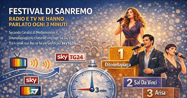 ROMA - Da martedì 24 febbraio alle 23.59 di domenica 1° marzo la voce "Festival di Sanremo" ha ottenuto 2.555 citazioni sulle radio e tv italiane: circa una ogni tre minuti. Il nome di Carlo Conti è invece ricorso 1.293 volte. I dati emergono dal monitoraggio effettuato da Mediamonitor.it, piattaforma che utilizza tecnologia e soluzioni sviluppate da Cedat 85, azienda attiva da oltre 40 anni nella fornitura dei contenuti provenienti dal parlato. Analizzando i singoli canali televisivi, ad esclusione di quelli Rai, scopriamo che la sola SkyTG24 si è occupata del Festival più di tutte le reti Mediaset messe insieme, citando la manifestazione 94 volte contro le 66 complessive di Canale 5, Rete 4, Italia 1 e TGCom24; in particolare quest'ultima, per la quale Mediamonitor.it registra 21 menzioni del Festival, viene battuta sia da Italia 1 che da La7, entrambe con 32 citazioni. Mediamonitor.it ha rilevato inoltre quali sono stati i cantanti del festival che nello stesso periodo hanno avuto più visibilità sulle radio e tv nazionali e locali. Dall'indagine emergono alcune sorprese rispetto alla classifica decretata all'Ariston: a fare man bassa di citazioni, infatti, è Ditonellapiaga (861), trionfatrice insieme a Tony Pitony nella serata dedicata alle cover, mentre il vincitore della kermesse, Sal Da Vinci, deve accontentarsi della seconda posizione (785). Terzo posto per Arisa (675), che precede Serena Brancale (613), data tra i favoriti della vigilia e finita invece in nona posizione. Con 593 citazioni, Fedez e Marco Masini confermano il quinto posto della classifica ufficiale; non riesce a fare altrettanto Sayf, il rapper arrivato sul podio alle spalle di Da Vinci che qui invece scivola in sesta posizione (579). Fulminacci, vincitore del Premio della critica "Mia Martini", è settimo con 565 menzioni, seguito da Tommaso Paradiso (424) ed Ermal Meta (378). La "top ten" sanremese di Mediamonitor.it si chiude con Elettra Lamborghini (354), che tra i "festini bilaterali" e i siparietti improvvisati per accumulare punti al Fantasanremo è stata indubbiamente una dei protagonisti di questo Festival. -foto ufficio stampa Cedat 85 - . mgg/com 07-Mar-26 09:20