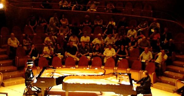 Con due spettacolari grancoda Fazioli posti l’uno di fronte all’altro, TeoTronico e Prosseda hanno dato vita alla loro sfida che si è consumata a colpi di Chopin (Notturno op. 9 n. 2), Scarlatti (Sonata in sol maggiore), Beethoven (Sonata al chiaro di luna), Mozart (Marcia alla turca) e Nuncarrow (Studio n. 2).