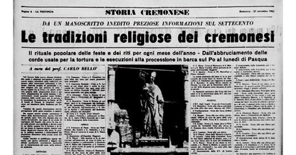 Nel fervore della nuova riforma liturgica, alla quale è chiamato attivamente il popolo, questo antico calendario delle tradii o il cremonesi offre interessanti indicazioni e conferme: festività proprie di parrocchie e ordini religiosi non più proemi in città i devoti letami fra la Città e le chiese, solennità proprie delle corporazioni darti e mestieri, dispensazioni di carità durante i riti, caratteristici rituali popolari come l'abbruciamento delle corde usate per la tortura e le esecuzioni, la processione in barca sul Po al lunedì di Pasqua, la frequente processione col simulacro della Madonna del Popolo.