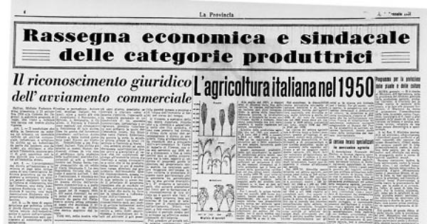 sviluppo rapido e costante, forse meno appariscente ma non meno sensibile di quello registrato nel settore industriale. L'indice della produzione agraria, che nel 1947 era ancora a 77,2 fatto 100 il 1938, e passato a 84,0 nel 1948, a 90 circa nel 1949 ed ha raggiunto il livello prebellico per il 1950, nonostante un non sempre favorevole andamento stagionale.