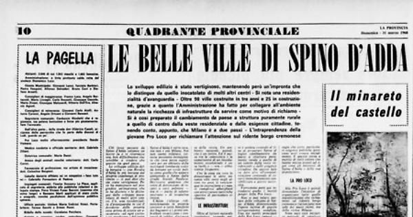 Lo sviluppo edilizio è stato vertiginoso, mantenendo però un'impronta che lo distingue da quello inscatolato di molti altri centri - Si nota una residenzialità d'avanguardia - Oltre 90 ville costruite in tre anni e 25 in costruzione, grazie a quanto l'Amministrazione ha fatto per collegare all'ambiente naturale la ricchezza di infrastrutture da servire come motivo di richiamo - Si è così preparato il cambiamento da paese a struttura puramente rurale a quello di centro dalla veste residenziale e dalle esigenze cittadine, tenendo conto, appunto, che Milano è a due passi - L'intraprendenza della giovane Pro Loco per richiamare l'attenzione sul ridente borgo cremonese.