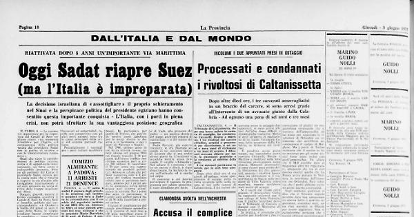 PORTO SUD, giugno. - T u tt o è p r o n t o per inaugurare di nuovo il Canale di Suez dopo centosei anni dalla festa gioiosa e ottimistica della sua a p e r t u ra e dopo otto dalla sua ostruzione: otto anni durame i quali era d i v e n t a t o una sanguinosa trincea. Tra poche ore sarà riaperta una via d'acqua la cui drammatica chiusura ha avuto notevoli ripercussioni sull'economia di tanti Paesi, massimamente per q u a n t o riguarda il settore petrolifero.