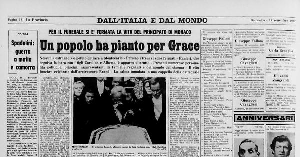 Mentre la campana della cattedrale suonava a morto nella piazza rullavano i tamburi, preceduta dalle corone portate dai volontari della Croce Rossa di cui Grace era presidentessa, dai membri della Confraternita dei penitenti neri della Misericordia (una pia associazione che assiste i malati) è uscita la bara coperta dalla bandiera bianca con lo stemma dei Grimaldi. Attorno le guardie d’onore con la divisa bianca e un nastro nero al braccio.