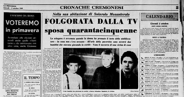 Una donna di 45 anni, sposata, madre di due ragazze, è morta folgorata dallo stabilizzatore della propria televisione. Il fatto è accaduto ieri l'altro sera verso le 18 il a Solarolo Monasterolo, frazione di Motta Baluffi, in località «Bicocca». La vittima è la signora Orlandina.