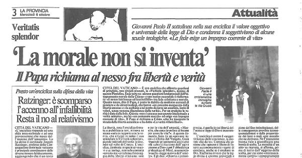 Giovanni Paolo II sottolinea nella sua enciclica il valore oggettivo e universale della legge di Dio e condanna il soggettivismo di alcune scuole teologiche. «La fede esige un impegno coerente di vita»