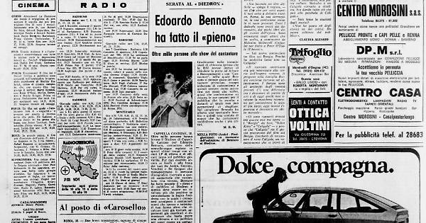CAPPELLA CANTONE, 18. Oltre mille persone hanno invaso il Diedron di Cappella Cantone per Edoardo Bennato, cantautore della nouvelle-vague esploso in questi ultimi tempi con alcuni LP di rilievo e di efficace presa sul pubblico giovanile. Pur non essendo ancora ai livelli e alla fama dei vari De Andrè, Guccini, Venditti e De Gregori che monopolizzano il mercato discografico riservato a questi cantastorie che raccontano vita vissuta, Bennato ha fatto proprio il «pieno» di pubblico al Diedron e questo deve essere un risultato più che positivo se consideriamo la logica freddezza con la quale i cremonesi accolgono i cantautori nuovi che spesso e volentieri non fanno altro che ricalcare temi già trattati, argomenti già masticati e dimostrare che basta avere una chitarra e un pubblico per saper essere un cantautore al giorno d'oggi.