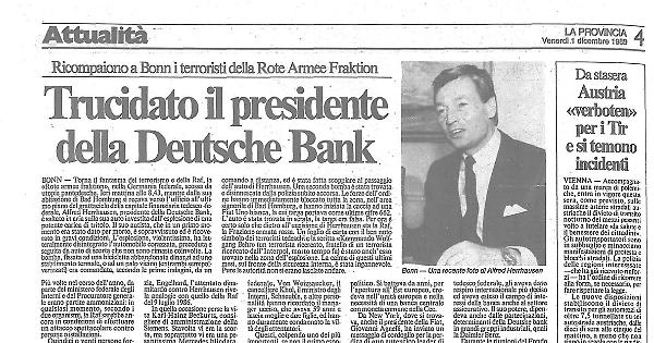 BONN — Torna il fantasma del terrorismo e della Raf, la «Rote armee fraktion», nella Germania federale, scossa da utopie pantedesche. Ieri mattina alle 8,43, mentre dalla sua abitazione di Bad Homburg si recava verso l'ufficio all'ultimo piano del grattacielo della capitale finanziaria tedesco -federale, Alfred Herrhausen, presidente della Deutsche Bank, è saltato in aria sulla sua auto investita dall'esplosione di una potente carica di tritolo. Il suo autista, che in un primo momento era stato dato per morto, è sopravvissuto ed è ricoverato in gravi condizioni. L'esplosione, violentissima, ha letteralmente disintegrato l'automobile corazzata, preceduta e seguita da auto di scorta che non sonò rimaste coinvolte. La bomba, fissata ad una bicicletta abbandonata dinanzi ad uno stabilimento termale, o ad un palo vicino (entrambi semipolverizzati) era comandata, secondo le prime indagini, da un comando a distanza, ed è stata fatta scoppiare al passaggio dell'auto di Herrhausen. Una seconda bomba è stata trovata e disinnescata dalla polizia subito accorsa. Le forze dell'ordine hanno immediatamente bloccato tutta la zona, nell'area signorile di Bad Homburg, e hanno iniziata la caccia ad una Fiat Uno bianca, la cui targa portava come ultime cifre 662. L'auto é stata trovata in serata, la targa era falsa. Per ora è certo solo che dietro all'uccisione di Herrhausen sta la Raf, la Frazione armata rossa. Un foglio di carta con il ben noto simbolo dei terroristi tedeschi e la scritta «Kommando Wolfgang Behr» (un terrorista ricercato, fratello di un terrorista ricercato dall' Interpol, morto tempo fa) è stato anch' esso trovato nella zona dell'esplosione. La calma di questi ultimi mesi, sul fronte della sicurezza interna, è stata ingannevole. Pure le autorità non si erano lasciate andare.