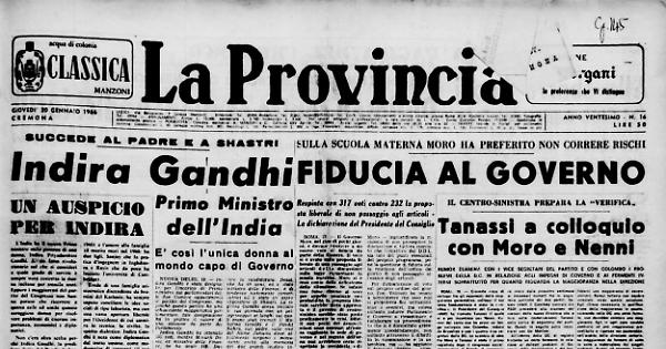 Indira Gandhi succede a Lal Bahadur Shastri, morto per infarto una decina di giorni fa a Tashkent (URSS), immediatamente dopo la conclusione della conferenza indo-pakistana. A sua volta Shastri era succeduto a Jawaharlal Nehru.