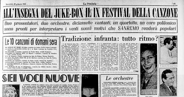 Il IX Festival della Canzone ha rotto, quest'anno, la tradizione. Vedremo se sarà una formula indovinata o sbagliata. Abbandonata la melodia, le venti canzoni presenteranno il ritmo anche se i testi parleranno il solito linguaggio dell'amore triste, dei baci furtivi e del chiaro di luna. Insomma gli autori si sono avvicinati allo stile, oggi assai in voga, dello «juke box». Vi saranno molti ritmi a terzine, molti «shuffle» (una specie "di rock and roll" moderato) qualche «beguine», mentre rarissima sarà la composizione classica all'italiana che imperò fino all'anno scorso e che si affermò recentemente in «Canzonissima».