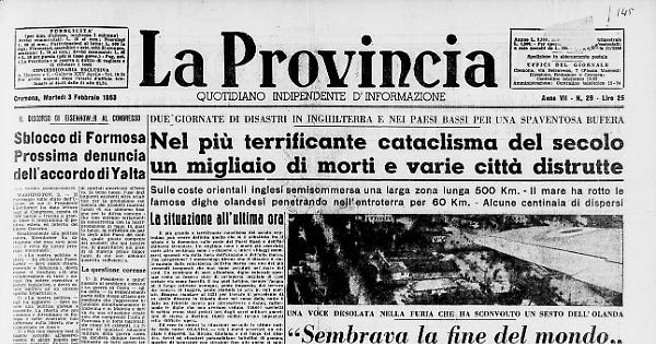 Il più grande e terrificante cataclisma del secolo ventesimo può essere definito quello che si è abbattuto tra il sabato e la domenica sulle coste dei Paesi Bassi e dell'Inghilterra Orientale. Un migliaio sono i morti già accertati; varie altre centinaia sono i dispersi; interi villaggi scomparsi, spazzati via dalla furia dell'uragano e dell'alta marea. Una spiegazione? I meteorologi dicono che il disastro è stato causato dalla coincidenza dell'alta marea con uno dei più tremendi temporali che mai siano accaduti nel mare del lord. Un centinaio di navi affondate, dighe colossali spezzate come se fossero state di cartapesta, migliaia di case portate via come fuscelli. E tra quel turbine, mentre l'acqua ed il fango salivano ovunque, gente impazzita dal terrore che tentava di fuggire, gente sbattuta in aria in voli mortali. Bisogna riandare al 1521 per trovare il precedente di in simile disastro in Olanda dove nel corso della notte è stato un febbrile lavoro per circoscrivere i danni, rafforzando le dighe che non avevano ceduto. 150.000 sacchetti di sabbia erano stati gettati ieri dagli aerei militari americani di stanza a Berlino; 16.000 soldati furono impegnati sella difficile opera.