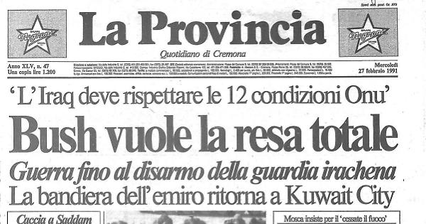 Bush annuncia che soltanto la resa incondizionata degli iracheni, in Kuwait ma anche nel sud dell'Iraq, e l'accettazione di tutti i 12 punti della risoluzione del Consiglio di sicurezza dell'Orni possono portare al cessate il fuoco. L'insistere americano su questo dato conferma l'ipotesi che l'obiettivo reale nella Casa Bianca sia quello della estromissione di Saddam dal potere. L'America mira alla disfatta totale del nemico e Israele teme, con Saddam al potere, una pace che porti alla divisione nel Medio Oriente in due sfere di influenza: una americana e l'altra sovietica.